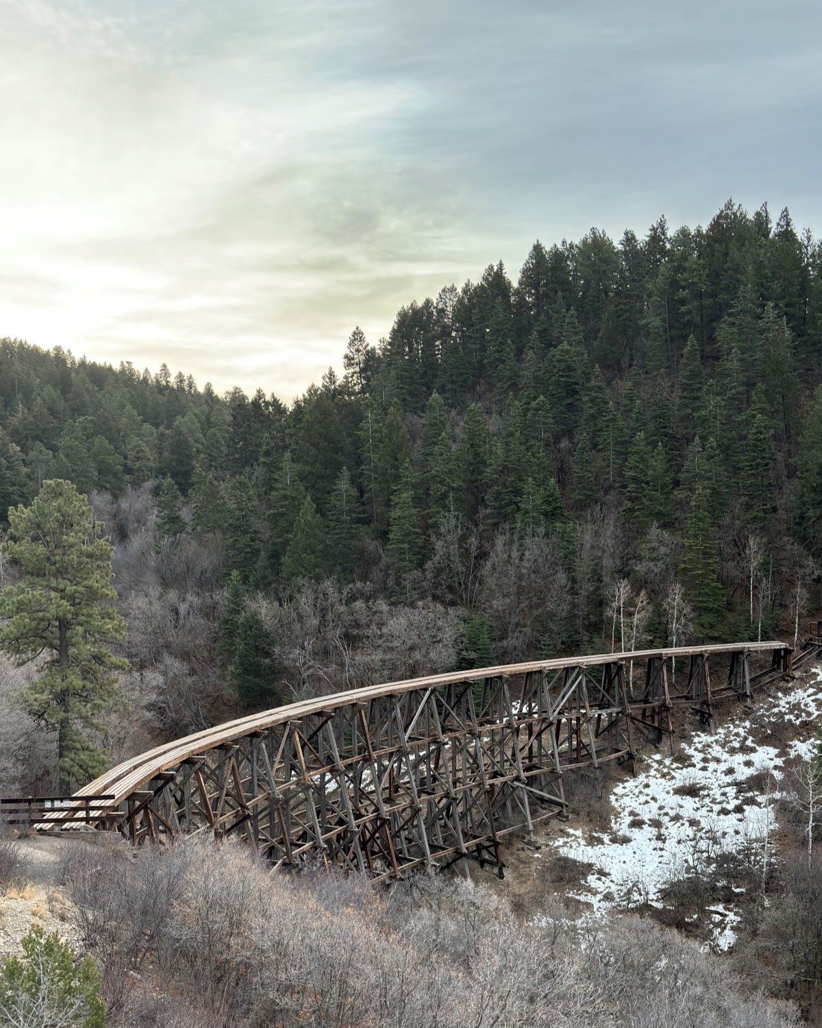 We got up early in the morning and headed up into the Lincoln National Forest as suggested. And boy was he right, we couldn’t make it in too far. But, we stopped at the Trestle bridge overlook which hangs in a dense pine forest, overlooking an old mountain railways trestle bridge. This was a stark contrast to the Chihuahuan desert we had been in for the past week. It was great to see so much green at last! But still freezing cold…