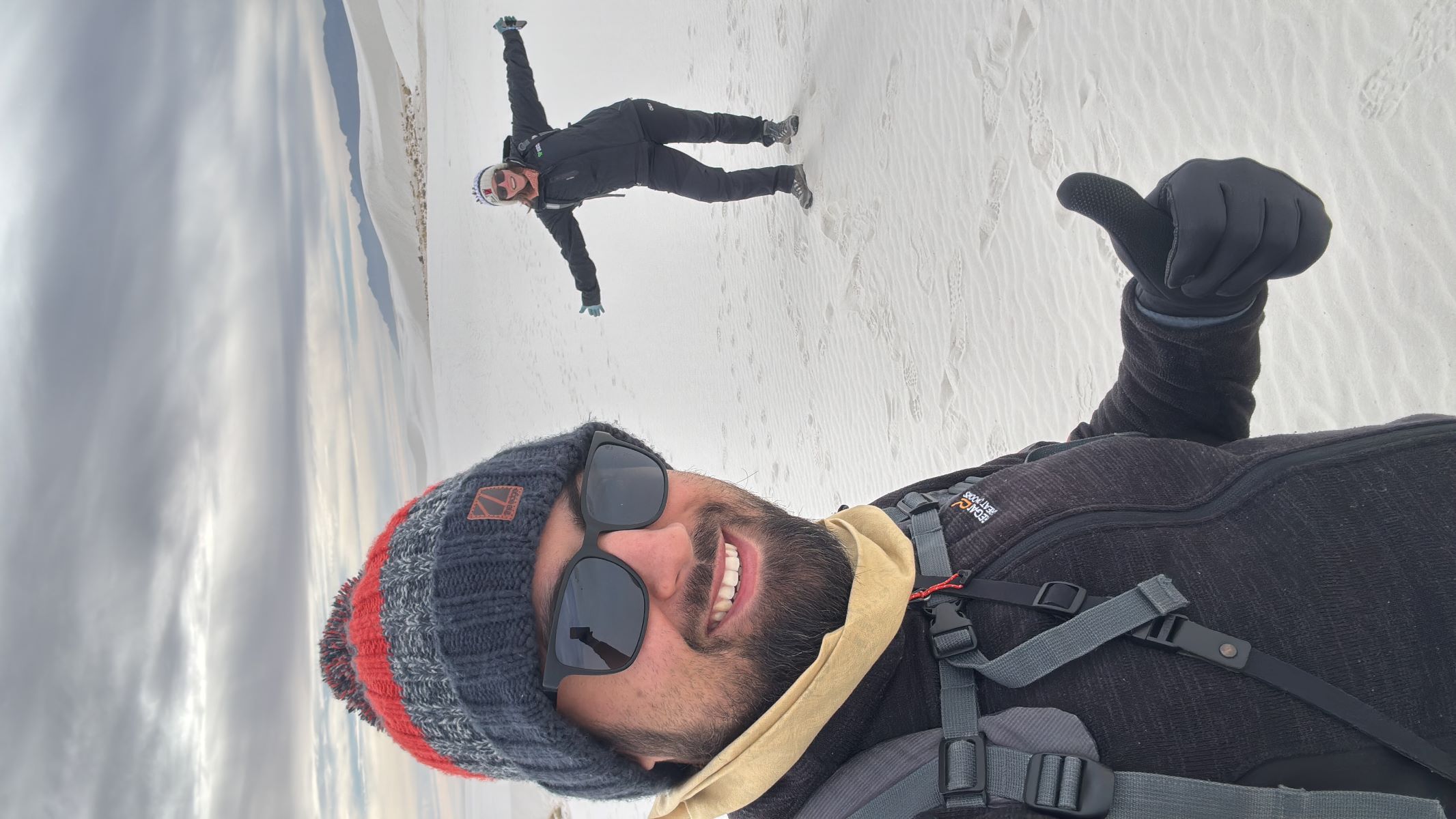 Putting it aside for now, we went on to the trailhead and hiked over the crystal white dunes on the Alkali Flats trail. This is not a flat trail in itself, but goes out to the flats. It in fact was arduous up and down gypsum sand dunes with temperatures below freezing given the coming winter storm. After halfway, I’d seen it and was done with it, but was still glad to have been and done it. But once you’ve hiked over sand dunes for 2.5 miles, the last thing you’re interested in is another 2.5 miles of hiking over sand dunes! 😅