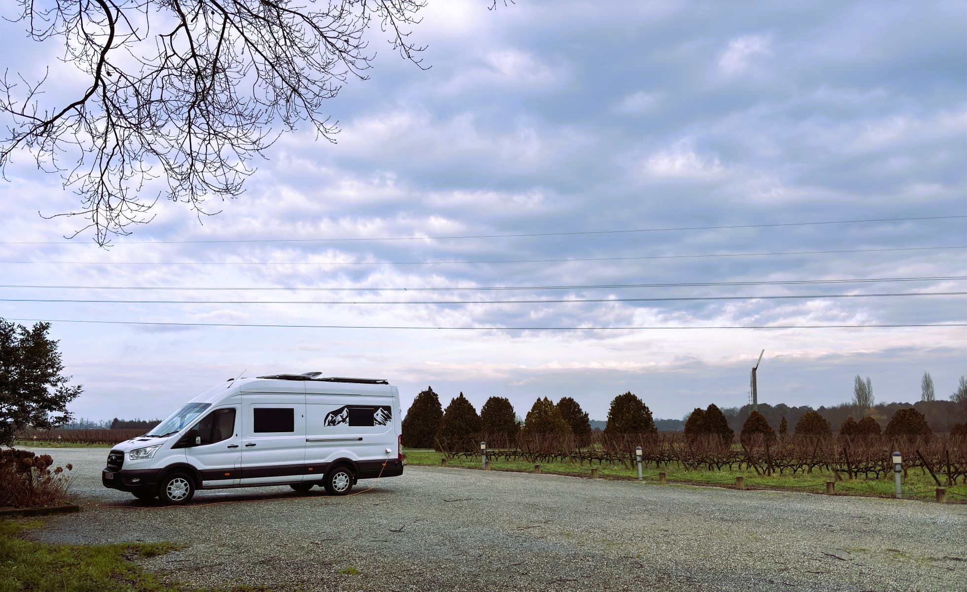 Noodle moved, we then walked through the chateau grounds hoping to buy a bottle as thanks for providing the Aire and facilities. But it all being shut as its February we continued on into the village to grab ourselves a baguette from the Boulangerie. Returning to the van, we unplugged and packed up, drained the grey tank and continued on around Bordeaux wine country.