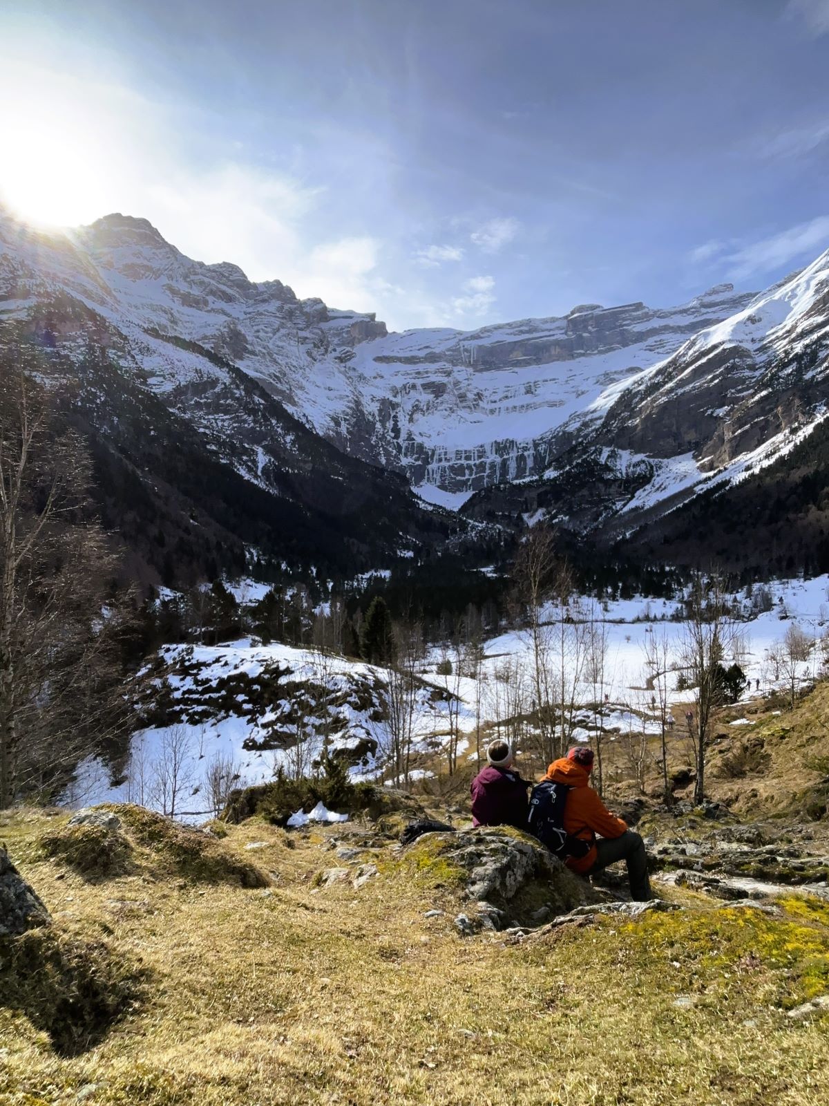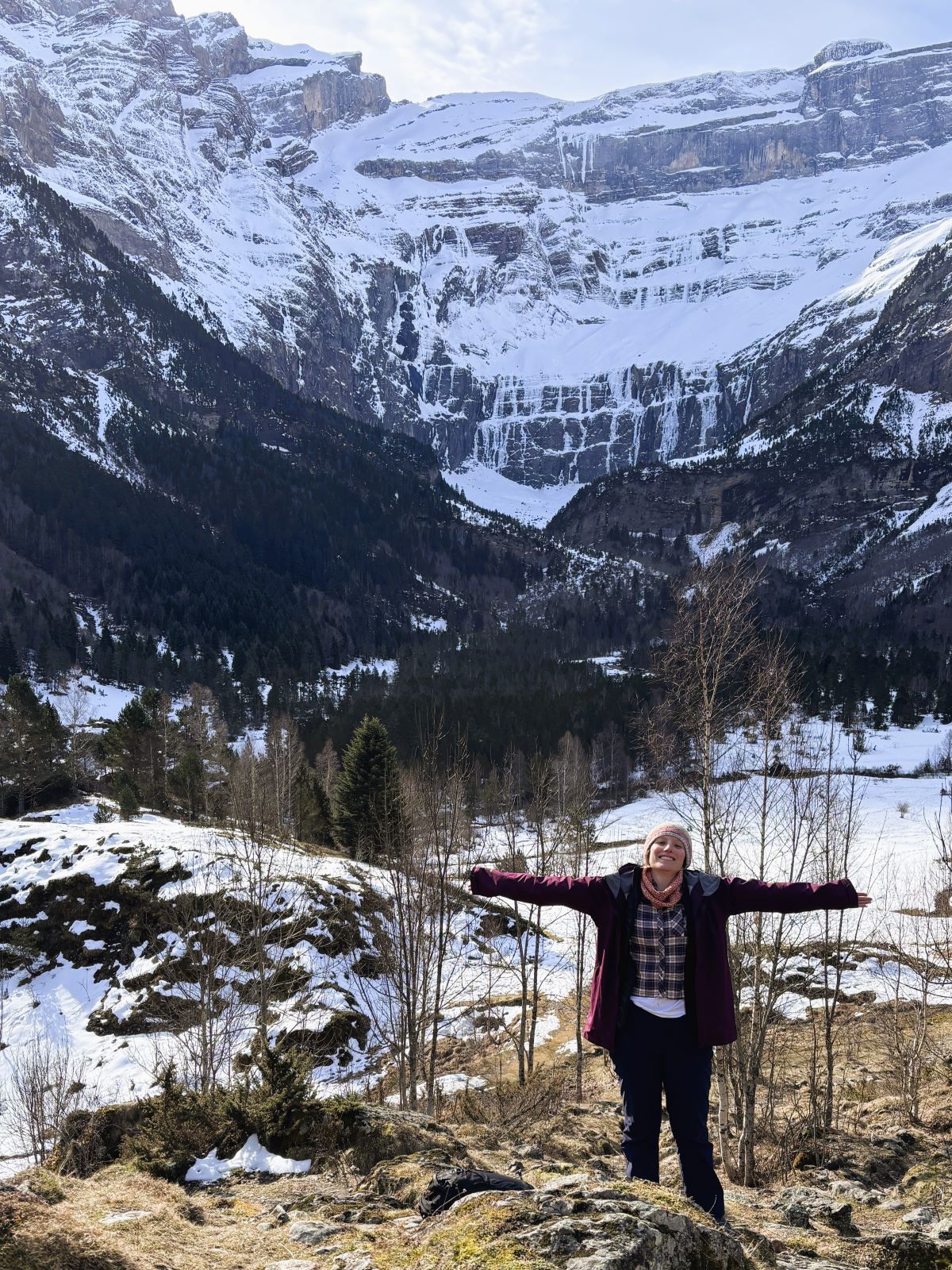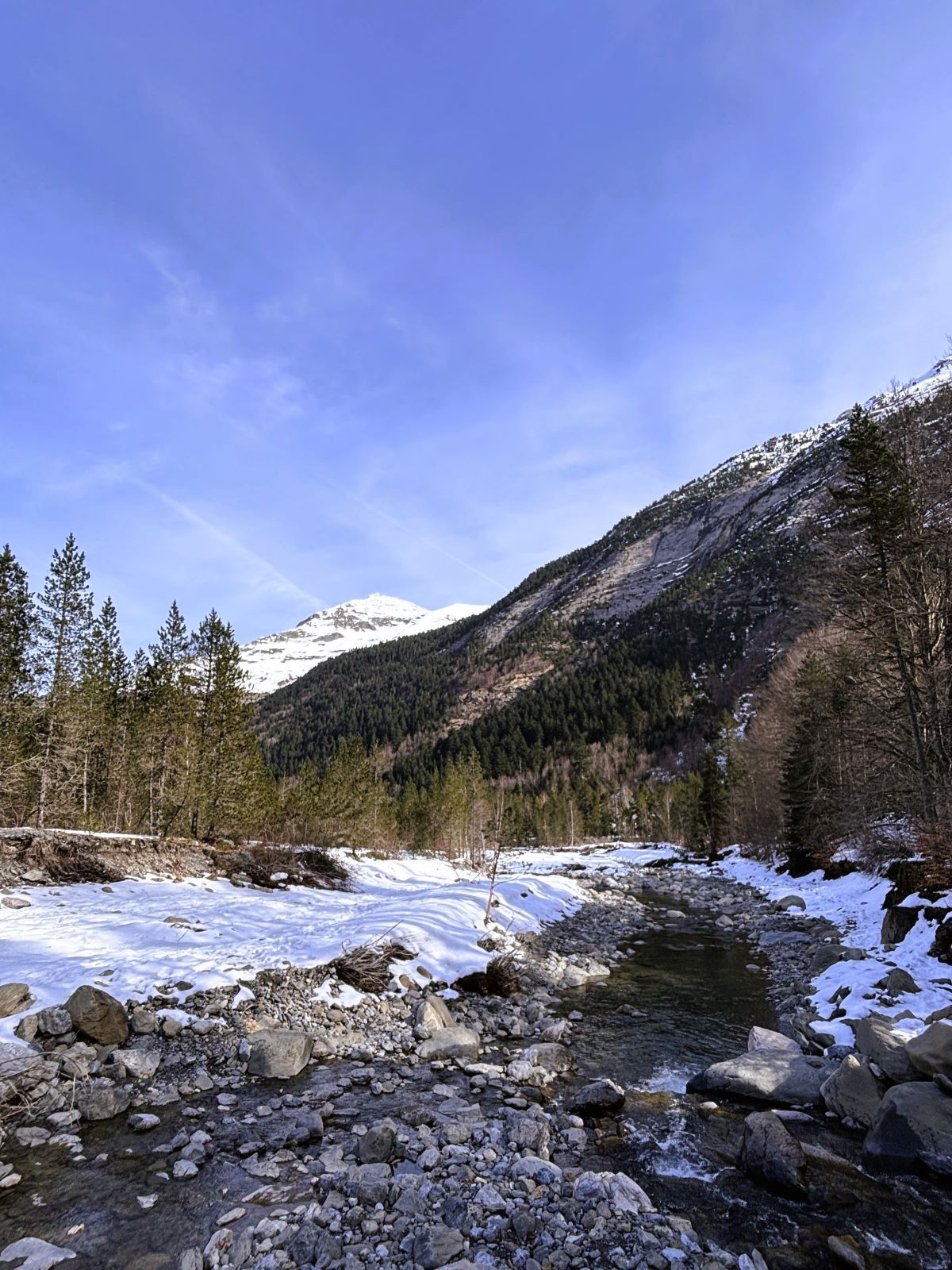 The next day, we started on our first proper hike of the trip. We headed out mid morning toward the Cirque de Gavarnie. A snowy dead end crater deep in the mountains veiled by the frozen Cascade de Gavernie, the tallest waterfall in mainland France. We wove our way through the snowy paths and eventually came to a point where we realised we had taken the path less travelled as a bridge across the wider part of the stream had collapsed and been swept downstream. The path on the other side had also been a casualty of this event and there was no obvious route to continue. We sat and fuelled up with the banana muffins Ellen had made the night before and then proceeded with some very off-piste navigation across the streams and up through powdery forest until we finally found the actual trail we should have taken originally. Still, what an adventure!