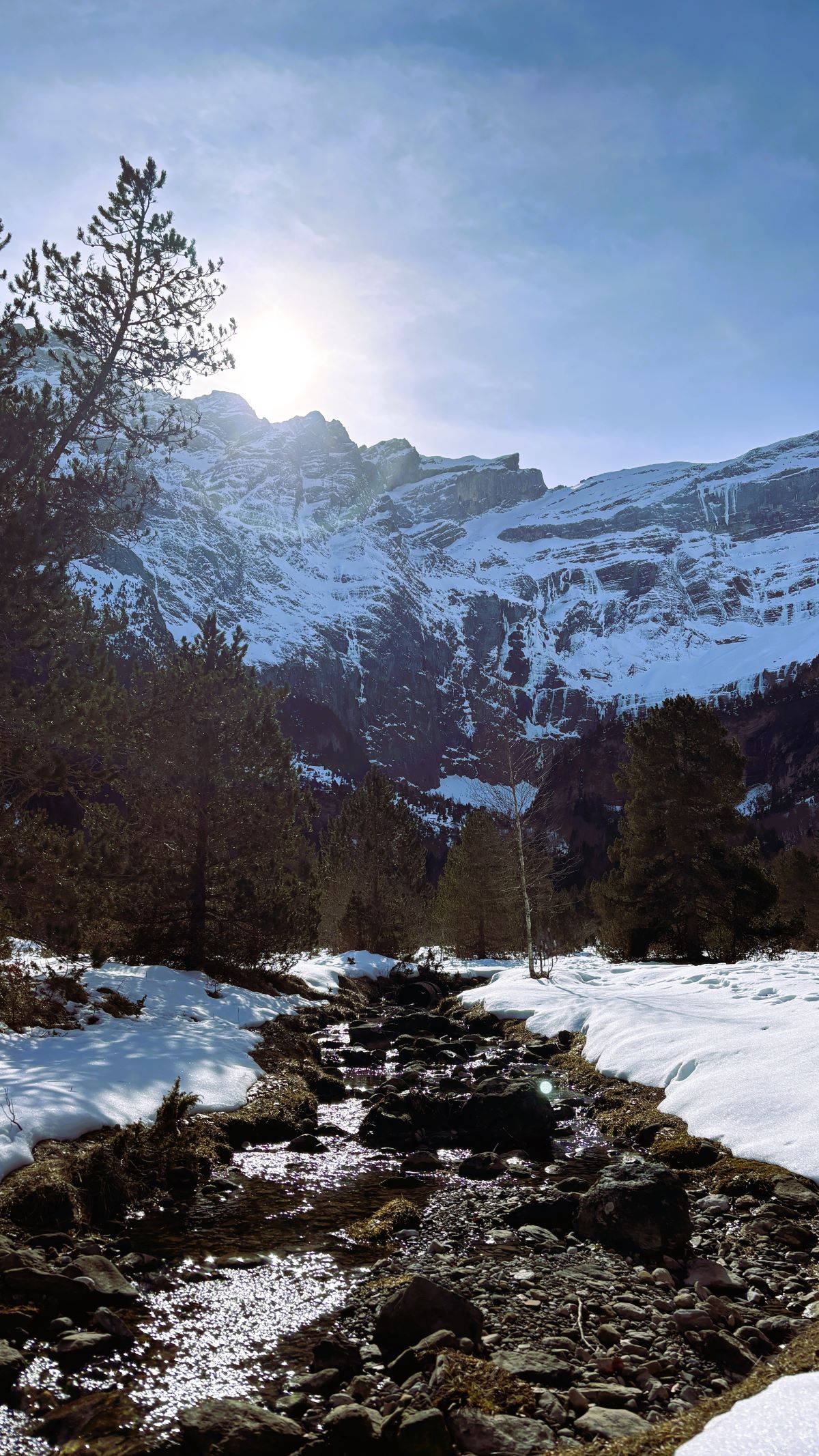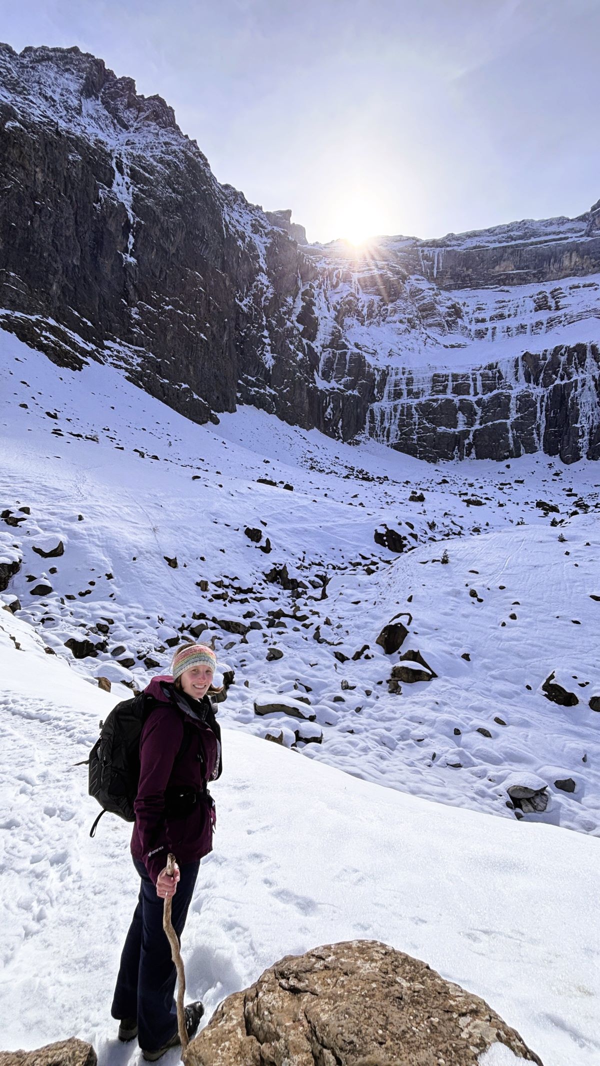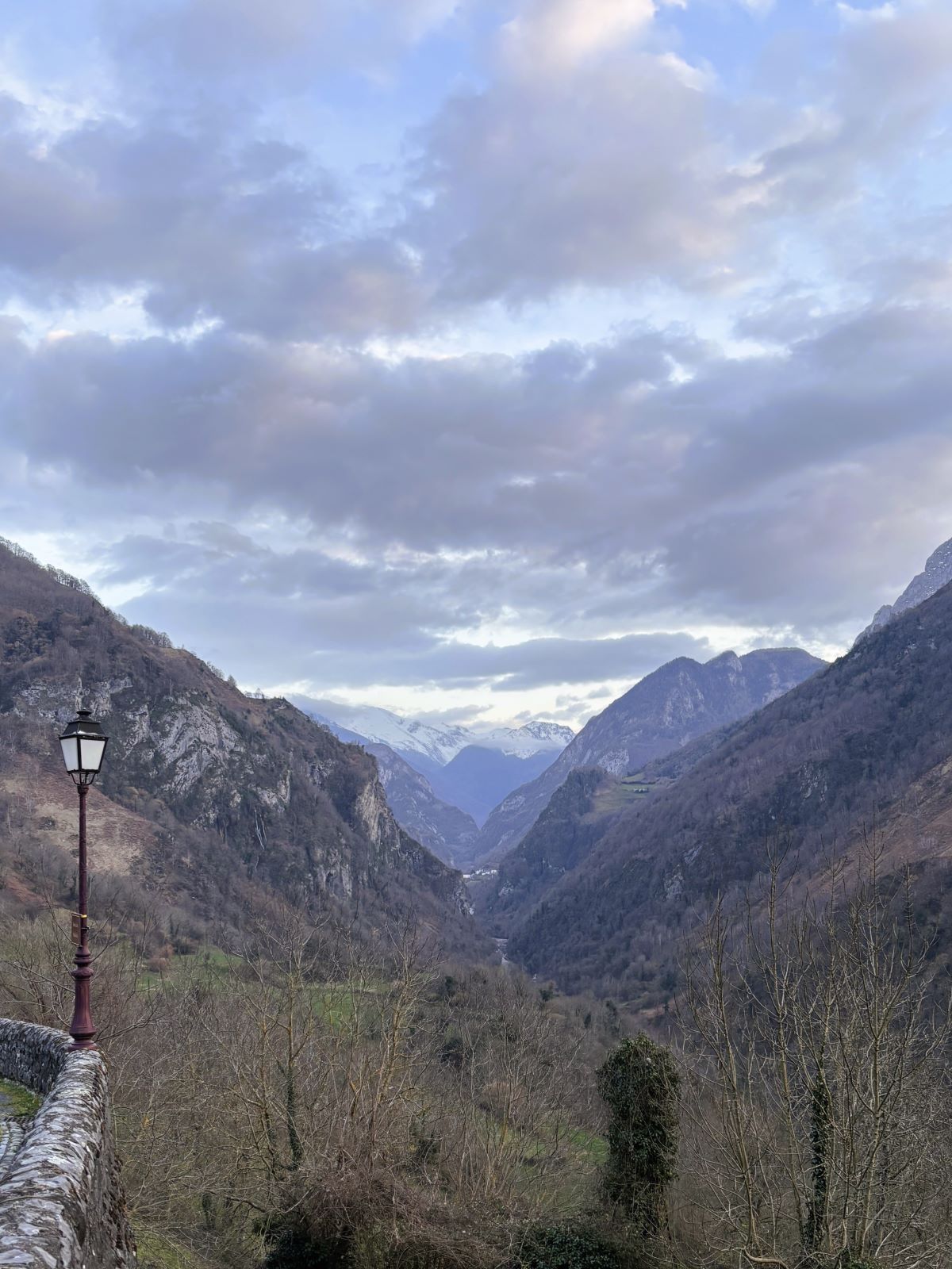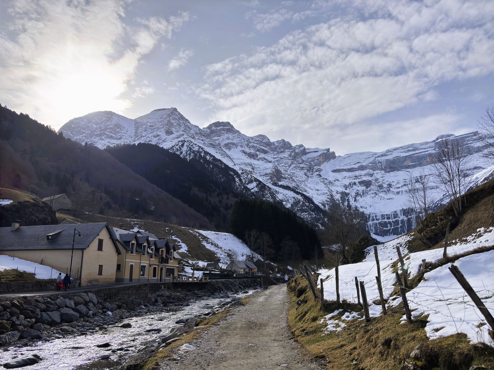 The next day, we started on our first proper hike of the trip. We headed out mid morning toward the Cirque de Gavarnie. A snowy dead end crater deep in the mountains veiled by the frozen Cascade de Gavernie, the tallest waterfall in mainland France. We wove our way through the snowy paths and eventually came to a point where we realised we had taken the path less travelled as a bridge across the wider part of the stream had collapsed and been swept downstream. The path on the other side had also been a casualty of this event and there was no obvious route to continue. We sat and fuelled up with the banana muffins Ellen had made the night before and then proceeded with some very off-piste navigation across the streams and up through powdery forest until we finally found the actual trail we should have taken originally. Still, what an adventure!