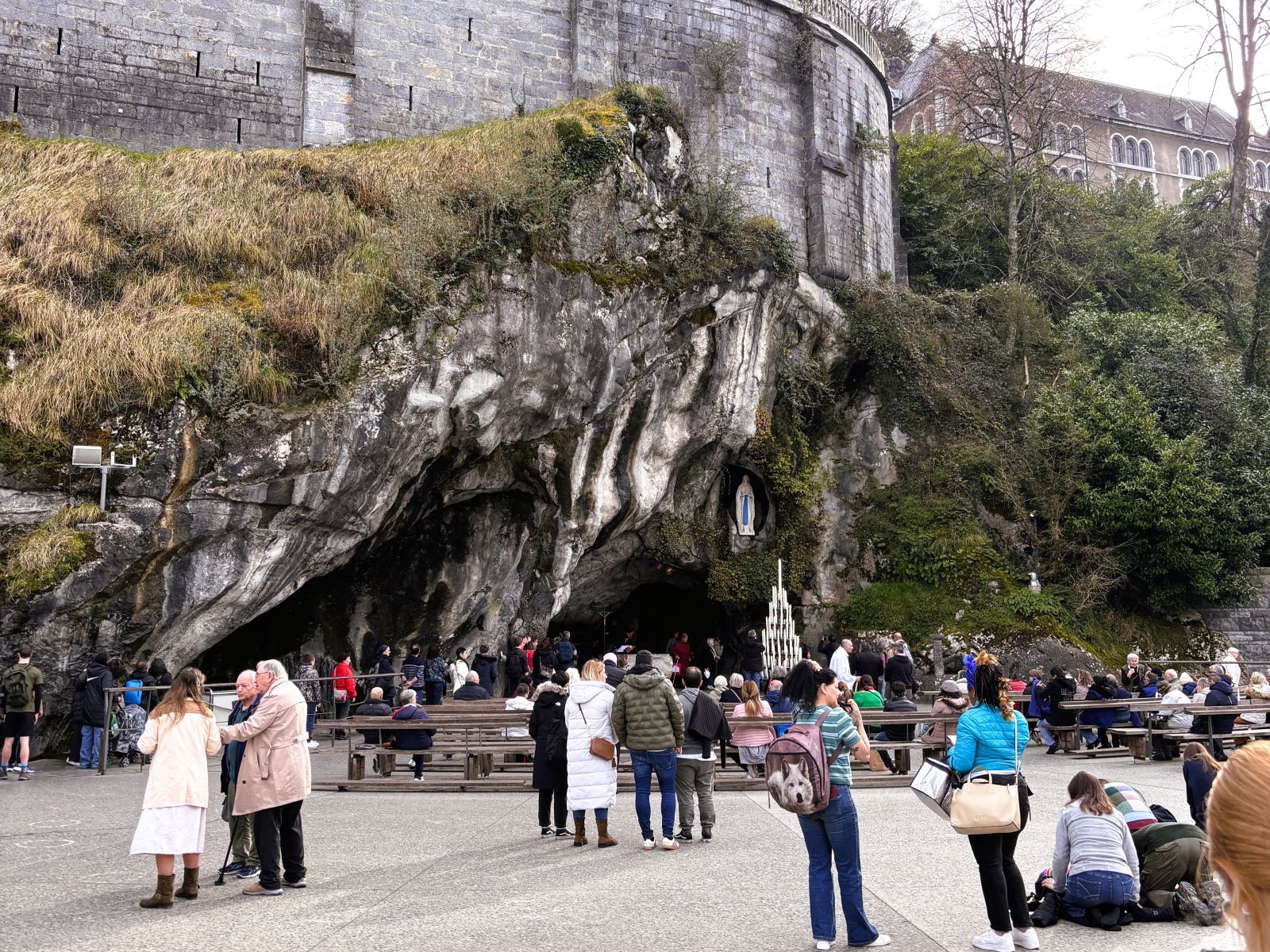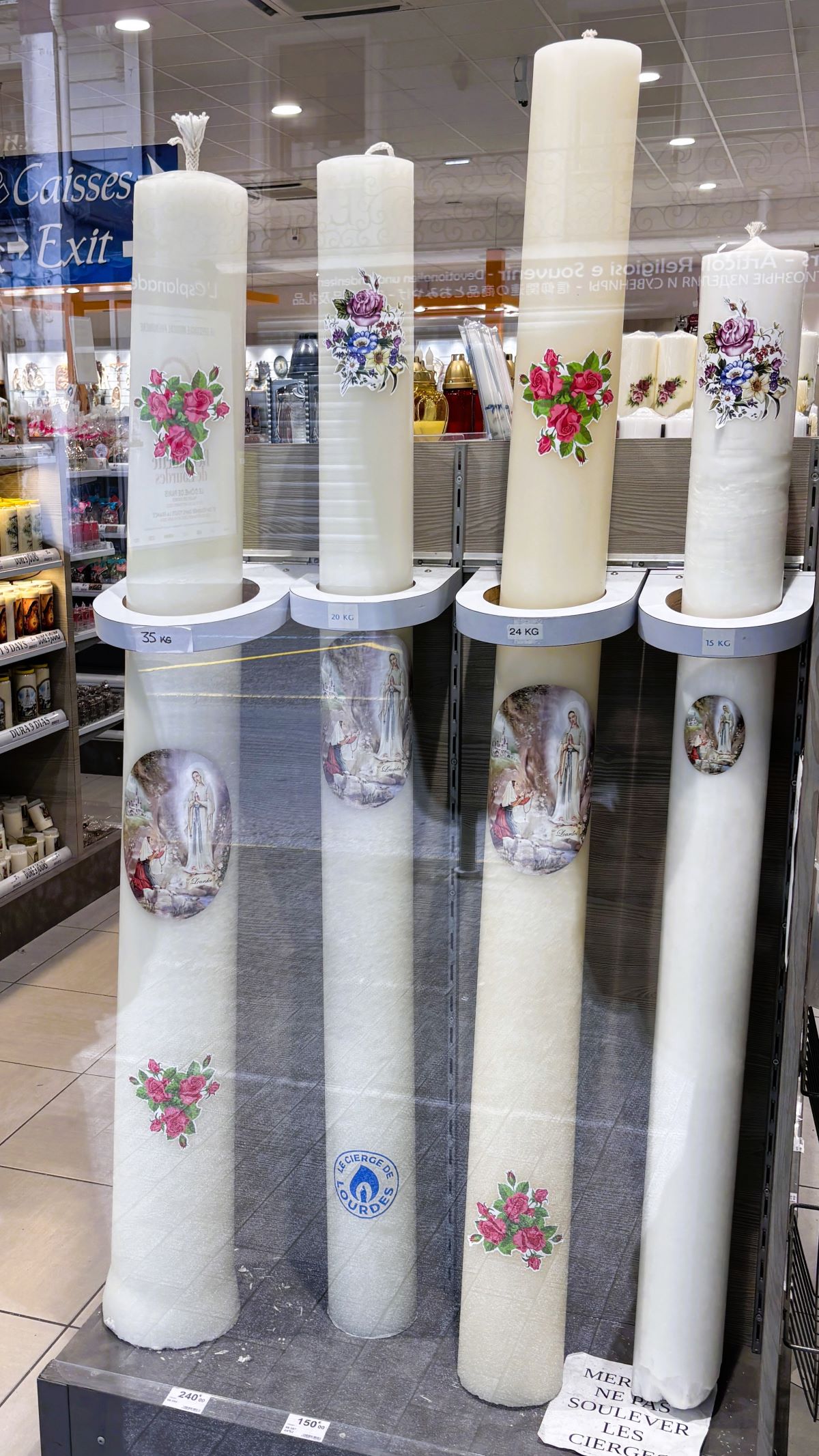 It was up here that we could see all around and I then pointed out a church that looked like a mix of the Disney castle and a fantasy Elven city. We looked it up and saw that it was the "Grotte" that we had seen signs for. Ellen then told me she had read about it in our Lonely Planet guide. Maybe I should read it once in a while! Turns out it is a major shrine in Catholism and people come from across the globe to visit it and get water from the spring there. Again this is also on the aforementioned pilgrimage route. We decided that whilst we don't go in for that sort of thing, it was probably only right that we visit it as we were here. So after we had finished at the Chateau, we headed through the warren of streets and found ourselves being shoved about by priests and nuns trying to buy all manner of tat in the many industrial sized souvenier shops. It was all very odd, but if you want a 35kg candle of the virgin Mary then this is apparently the place.