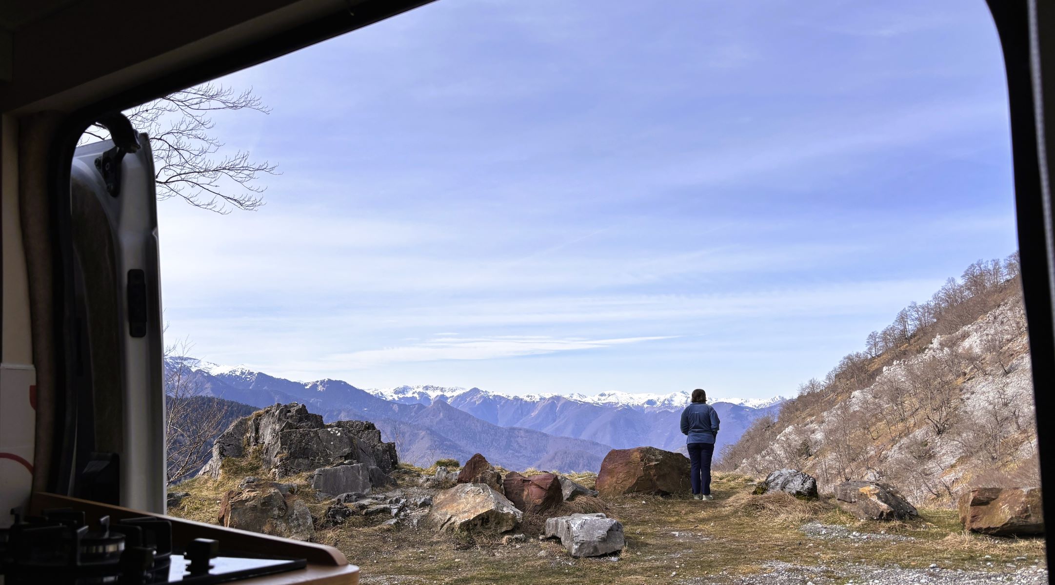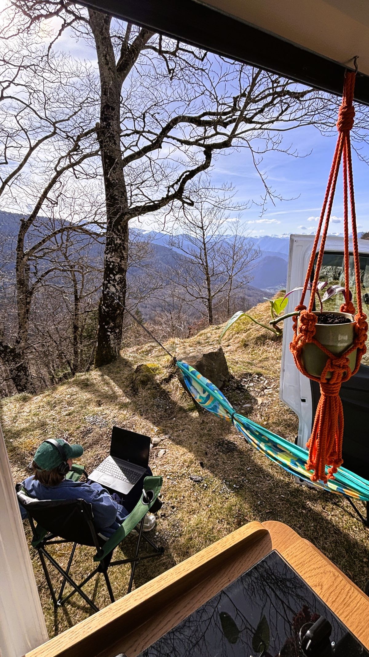 On the way up, we passed a little pull off at the side of one of the switch backs, just below the Col itself and the ski resort slightly further up the mountain. We decided this would be a nice place to spend lunch, then we could find somewhere further on later. This was such a great spot in the sun that we quickly realised that more driving was not going to be worth it, so we repositioned, set up the hammock between the van and a tree hanging off the cliff and settled in. Ellen did what she needed to and I chilled in the sun. Unfortunately I chilled in the sun a bit too long and with too little water and found myself feeling a bit rough. Ellen headed out on her own for a hike up the mountain and I stayed behind trying to drink plenty of water and recover. We spent the evening watching the sun set over the mountains and then headed to bed for what we didn't plan at the time to be the last time in the van for a week.